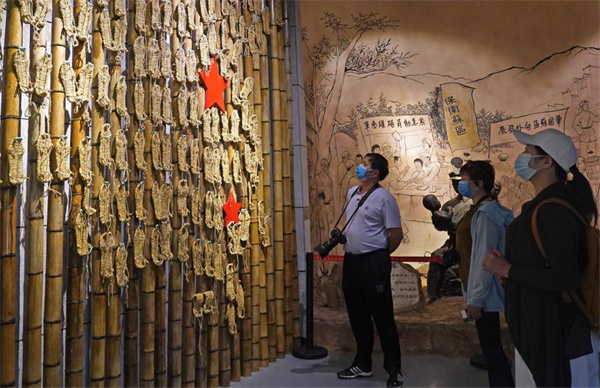 在江西省于都縣中央紅軍長(zhǎng)征出發(fā)紀(jì)念館,游客參觀草鞋組成的“草鞋墻”(2021年4月30日攝)。新華社記者萬(wàn)象攝