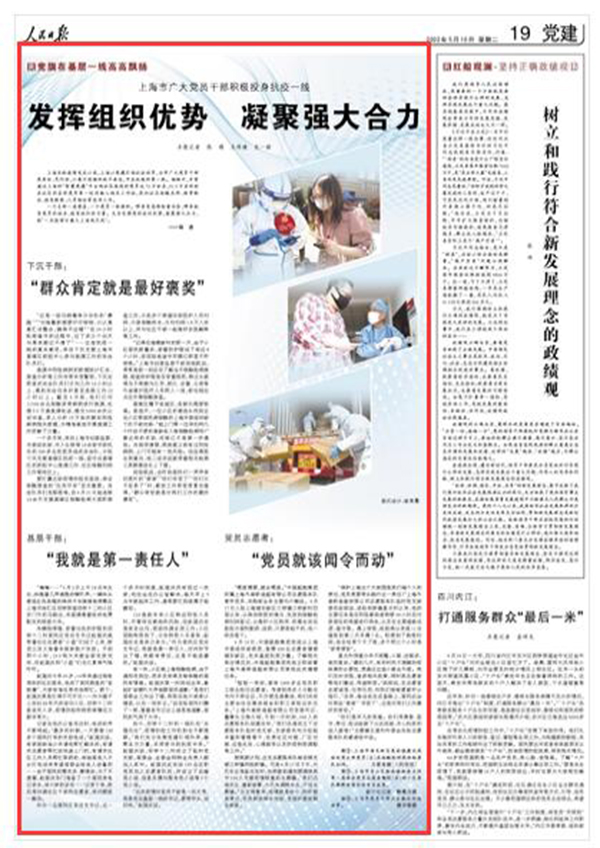 一個(gè)支部一座堡壘,一個(gè)黨員一面旗幟。哪里有急難險(xiǎn)重任務(wù),哪里就有黨員的擔(dān)當(dāng)、就有組織的力量。充分發(fā)揮黨的組織優(yōu)勢(shì),凝聚強(qiáng)大合力,就“一定能夠打贏大上海保衛(wèi)戰(zhàn)”。