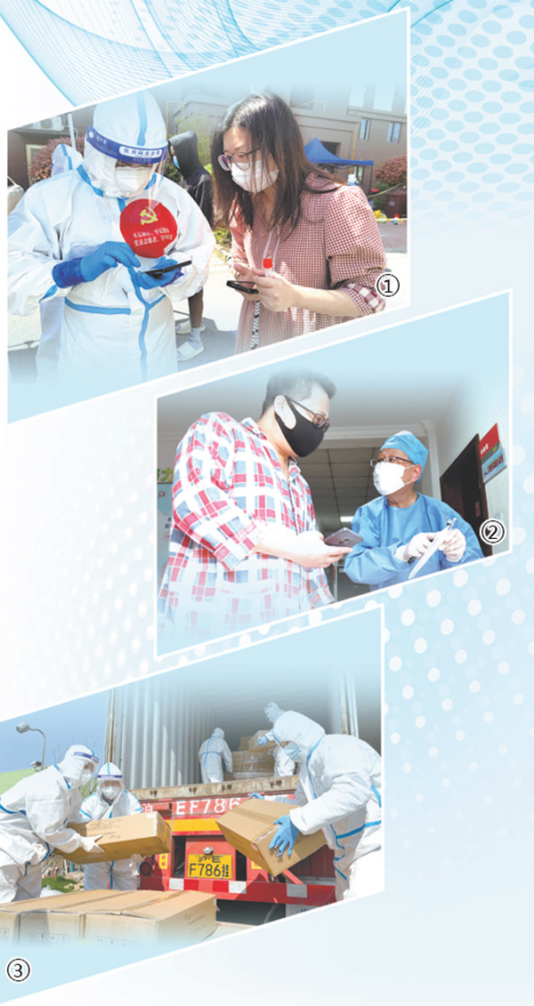 圖①:上海市浦東新區(qū)惠南鎮(zhèn)建欣苑臨時(shí)黨支部黨員(左)在核酸檢測(cè)現(xiàn)場(chǎng)給居民掃碼。方宏生攝(人民視覺)