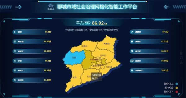 試點(diǎn)工作中,聊城市運(yùn)用市域社會(huì)治理智能化平臺(tái)助力深化平安建設(shè),在平臺(tái)定期生成全市“平安指數(shù)”,涵蓋各縣區(qū)社會(huì)治安、道路交通、安全生產(chǎn)等10項(xiàng)指標(biāo),引導(dǎo)精準(zhǔn)查找、整改短板問題。針對(duì)重大活動(dòng),發(fā)揮平臺(tái)研判決策、指揮調(diào)度功能,對(duì)問題及時(shí)發(fā)現(xiàn)處置,助力工作嚴(yán)格落實(shí)。