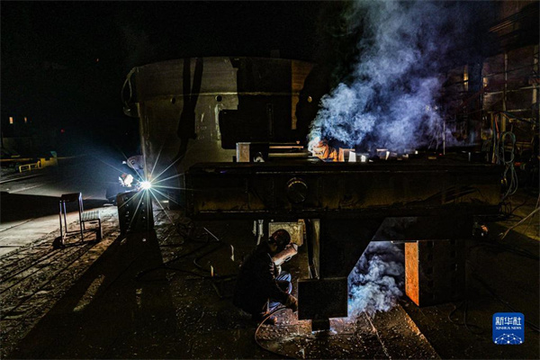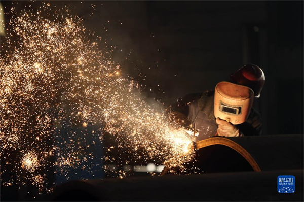 在沈陽北方重工集團(tuán)有限公司,工人在車間焊接產(chǎn)品(2022年3月24日攝)。 新華社發(fā)
