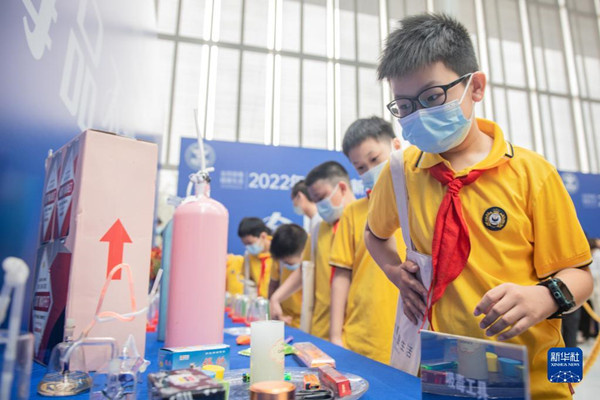 6月23日,小朋友們參觀人體吸毒血液演示模型。