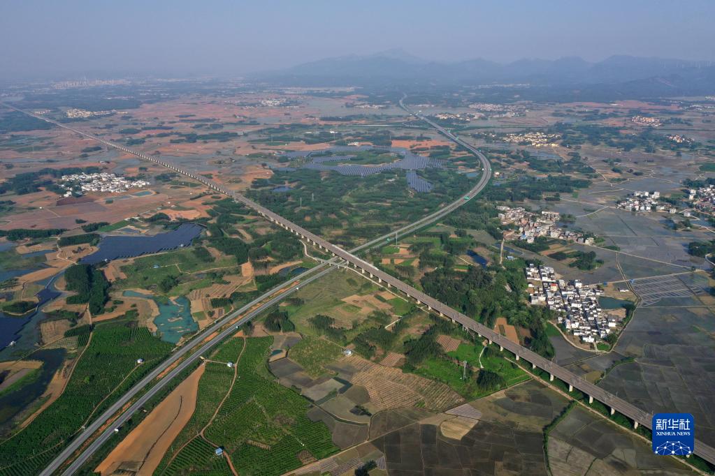 南廣高鐵和蒼碩高速在廣西賓陽(yáng)縣古辣鎮(zhèn)交匯(2022年4月4日攝,無(wú)人機(jī)照片)。新華社記者 黃孝邦 攝