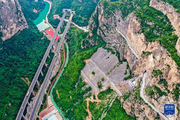 這是通過(guò)山西省長(zhǎng)治市平順縣虹梯關(guān)鄉(xiāng)的高速公路(畫(huà)面左側(cè)),一旁是過(guò)去的“掛壁公路”(畫(huà)面右側(cè))(2022年7月5日攝,無(wú)人機(jī)照片)。新華社記者 曹陽(yáng) 攝