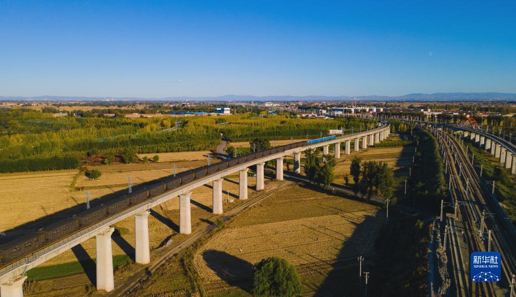 這是在內(nèi)蒙古呼和浩特拍攝的運煤專列(2021年10月15日攝,無人機(jī)照片)。新華社發(fā)(夏亮 攝)