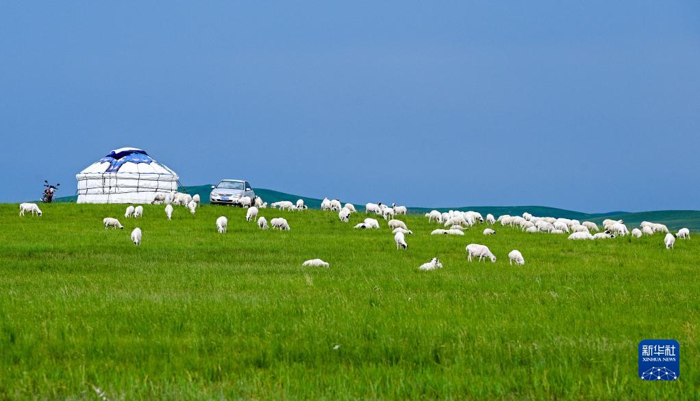羊群在內(nèi)蒙古錫林郭勒盟的草原上覓食(2021年7月15日攝)。新華社記者 連振 攝