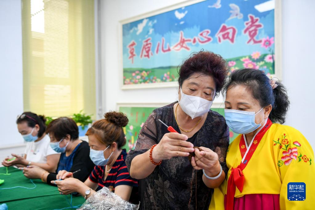 內(nèi)蒙古赤峰市興安街道臨潢家園社區(qū)居民柳桂俠(右二)為民族技藝傳承班的學(xué)員講解編織技巧(2021年8月31日攝)。新華社記者 貝赫 攝