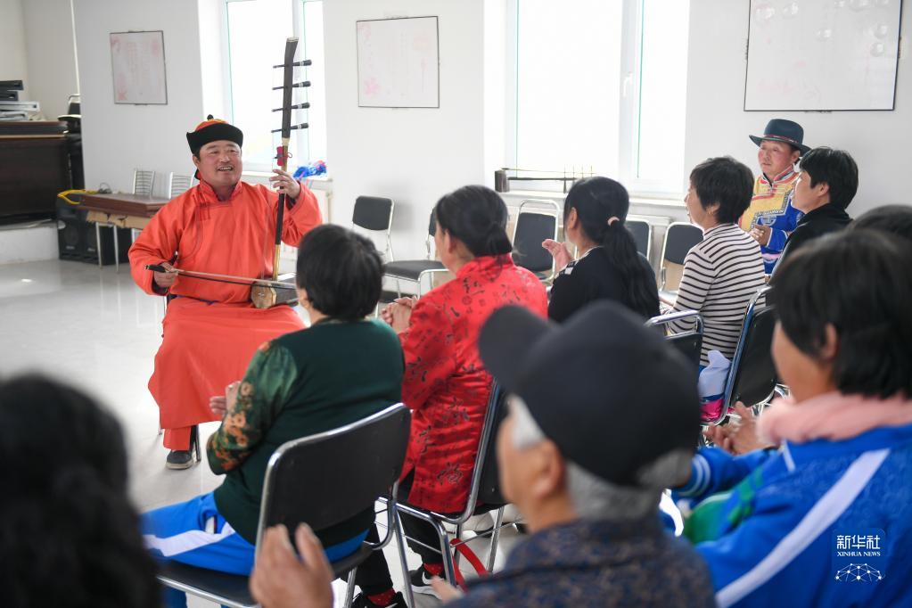 內(nèi)蒙古興安盟科爾沁右翼中旗巴彥敖包嘎查的蒙古族村民在鄉(xiāng)村文化活動室表演蒙古族藝術(shù)烏力格爾(2019年4月17日攝)。新華社記者 彭源 攝