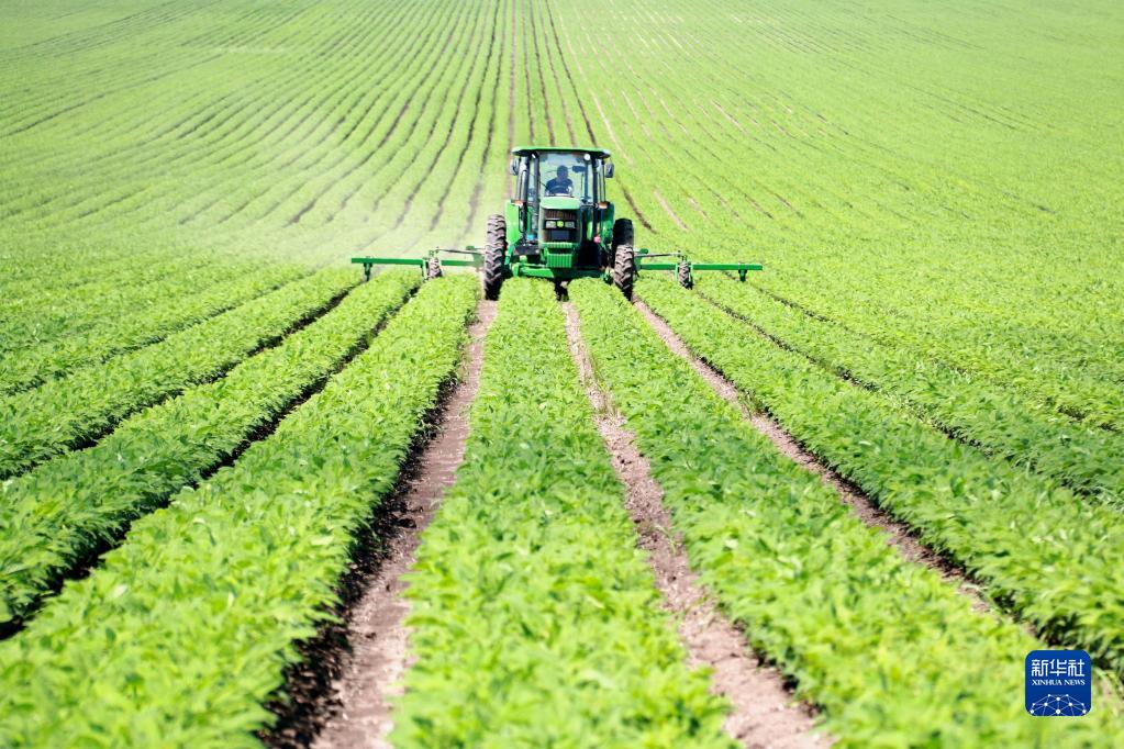 黑龍江北大荒農(nóng)墾集團五大連池農(nóng)場有限公司工作人員進行大豆中耕除草作業(yè)(2022年6月29日攝)。新華社發(fā)(陸文祥 攝)