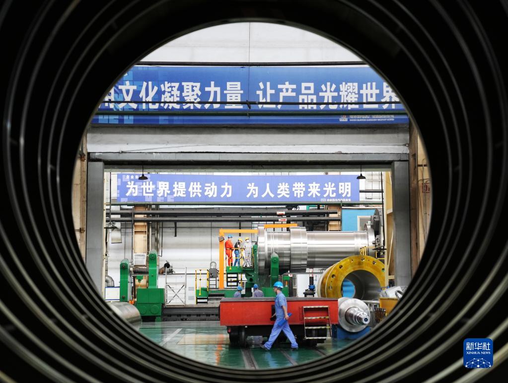 在哈電集團哈爾濱電機廠有限責(zé)任公司車間,工人進行生產(chǎn)作業(yè)(2022年6月27日攝)。新華社記者 王建威 攝