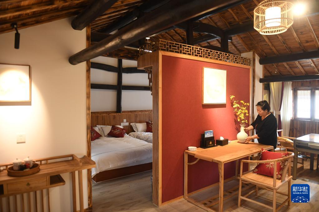 服務員在浙江省磐安縣烏石村一家民宿內(nèi)整理房間(2019年4月24日攝)。新華社記者 翁忻旸 攝