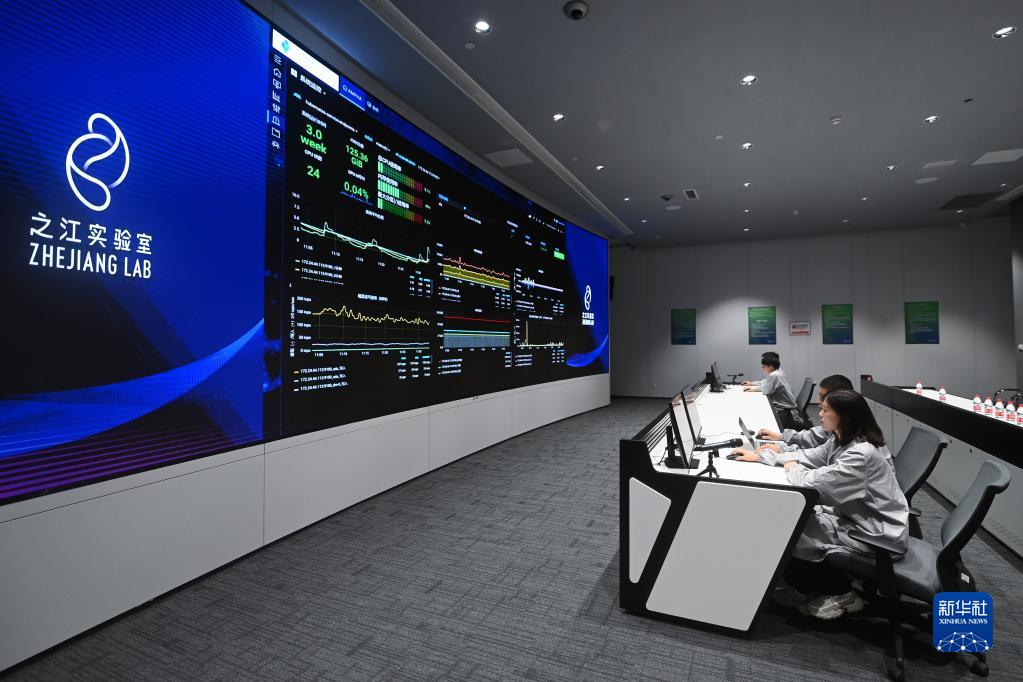 在之江實驗室計算與數(shù)據(jù)中心,工程師們通過“之江云”系統(tǒng)監(jiān)測服務器集群的運行狀態(tài)(2022年6月23日攝)。新華社記者 黃宗治 攝