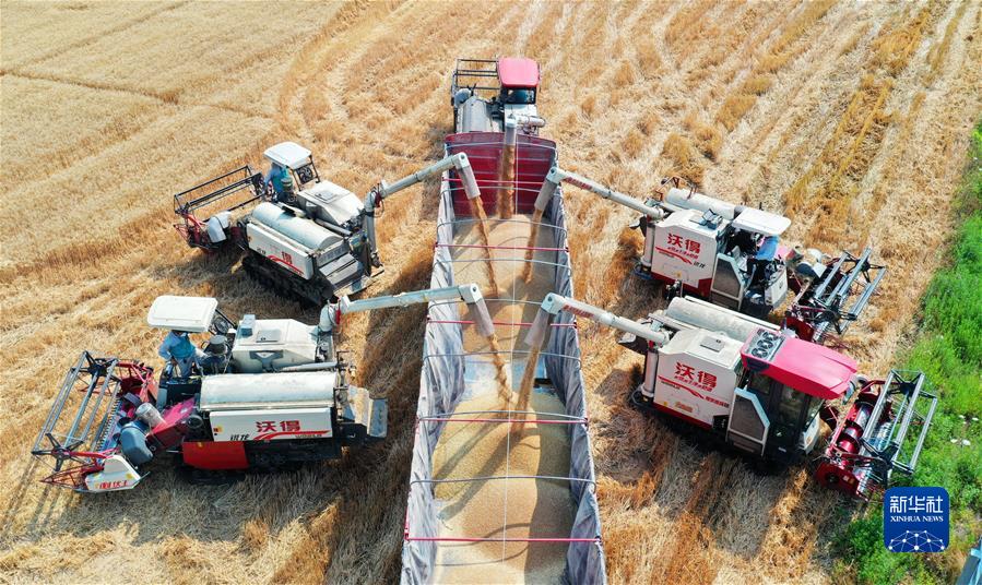 在合肥市蜀山區(qū)小廟鎮(zhèn)段沖村,收割機(jī)將小麥裝車,確保顆粒歸倉(2022年5月25日攝,無人機(jī)照片)。新華社發(fā)(陳三虎 攝)