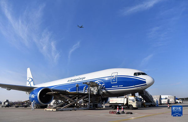 鄭州新鄭國際機(jī)場工作人員在為一架俄羅斯空橋貨運航空公司貨機(jī)裝貨(2021年12月30日)。新華社記者 李嘉南 攝