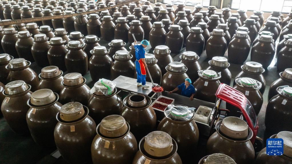 位于四川省眉山市的四川老壇子食品有限公司的工人在撈取已經(jīng)腌制好的泡菜(2022年6月24日攝,無人機照片)。新華社記者 沈伯韓 攝