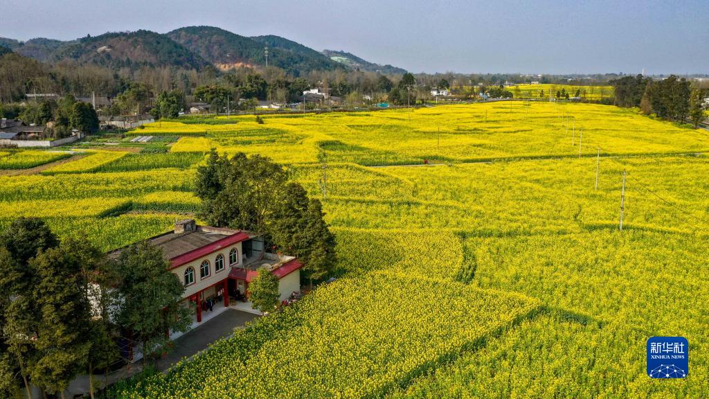 在四川成都崇州市拍攝的油菜花田(2020年2月25日攝,無人機照片)。新華社記者 王曦 攝