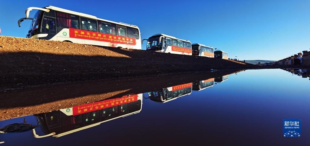 在西藏那曲市雙湖縣多瑪鄉(xiāng)拍攝的整裝待發(fā)的車隊(duì),客車載著牧民前往位于山南市貢嘎縣的森布日安置點(diǎn)(2022年7月19日攝)。新華社記者 沈虹冰 攝
