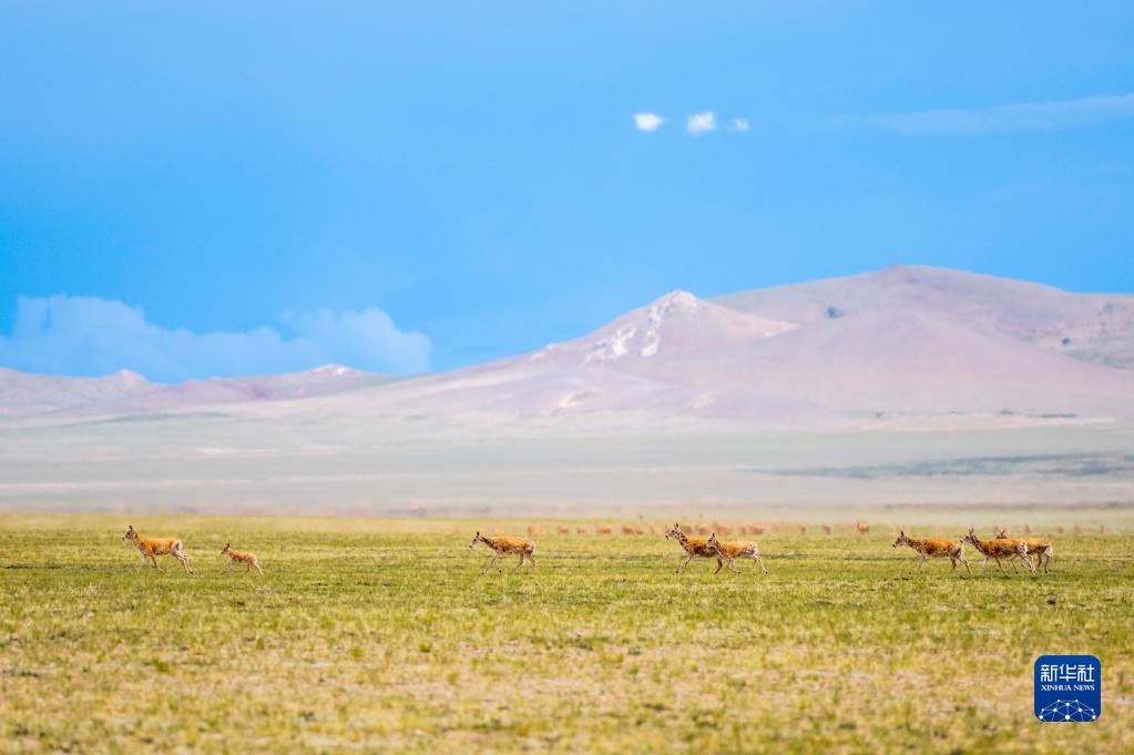 在西藏自治區(qū)北部的羌塘國(guó)家級(jí)自然保護(hù)區(qū),藏羚羊在草原上奔跑(2022年7月11日攝)。新華社記者 周荻瀟 攝