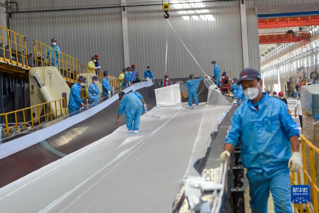 新疆生產(chǎn)建設(shè)兵團新星經(jīng)濟技術(shù)開發(fā)區(qū)一家風(fēng)電葉片企業(yè)的員工在車間忙碌(2022年7月27日攝)。新華社記者 丁磊 攝