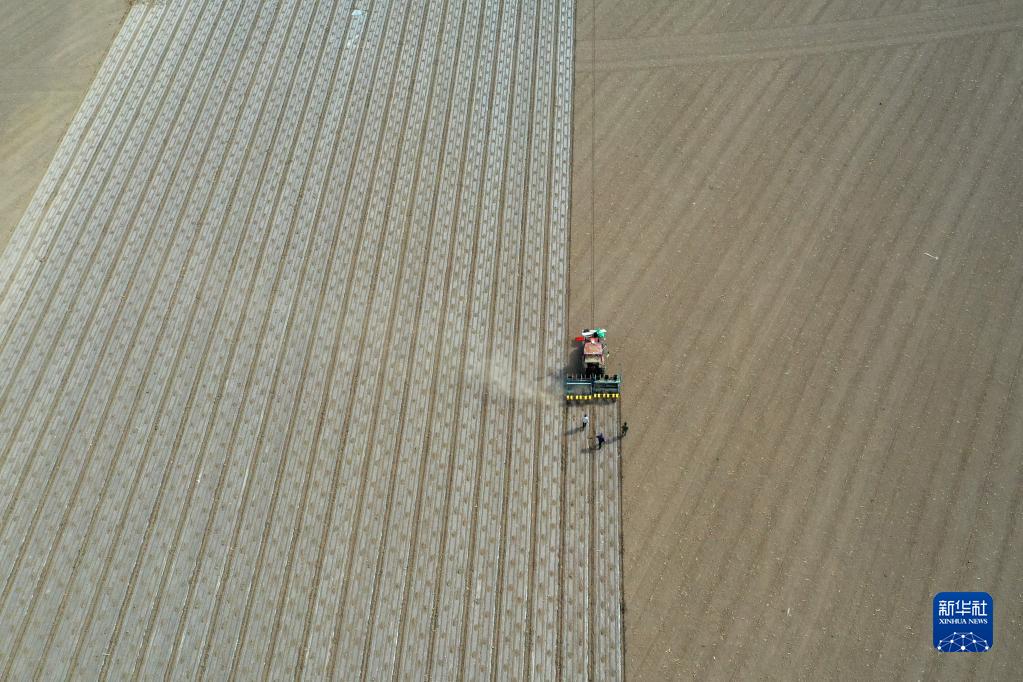 在新疆生產(chǎn)建設(shè)兵團第六師共青團農(nóng)場的棉田里,職工操作搭載北斗導(dǎo)航系統(tǒng)的播種機進行春播(2022年4月19日攝,無人機照片)。新華社記者 丁磊 攝
