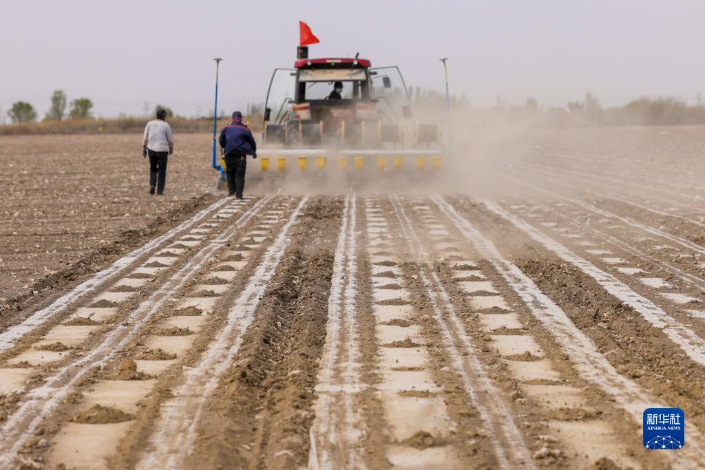 在新疆生產(chǎn)建設(shè)兵團第六師共青團農(nóng)場的棉田里,職工操作搭載北斗導(dǎo)航系統(tǒng)的播種機進行春播(2022年4月19日攝)。新華社記者 丁磊 攝