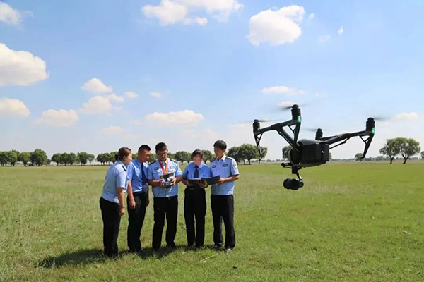 內(nèi)蒙古自治區(qū)鄂爾多斯市鄂托克前旗檢察院聚焦“馬蘭衛(wèi)士·綠色先鋒”公益訴訟品牌,全力打造鄂托克前旗生態(tài)保護(hù)檢察名片。圖為2020年8月,該院干警使用無人機(jī)巡查草原生態(tài)保護(hù)情況。 辛美娜 攝
