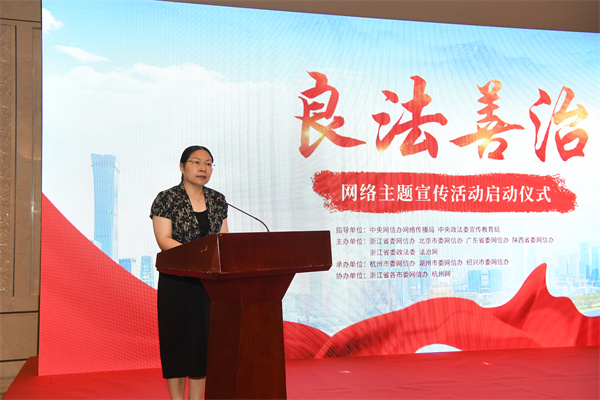 9月6日,由中央網(wǎng)信辦網(wǎng)絡(luò)傳播局、中央政法委宣傳教育局指導(dǎo),法治網(wǎng)及北京、浙江、廣東、陜西網(wǎng)信辦主辦,中國互聯(lián)網(wǎng)發(fā)展基金會(huì)中國正能量網(wǎng)絡(luò)傳播專項(xiàng)基金提供支持的“良法善治”網(wǎng)絡(luò)主題宣傳活動(dòng)在浙江杭州啟動(dòng)。圖為活動(dòng)現(xiàn)場(chǎng)。