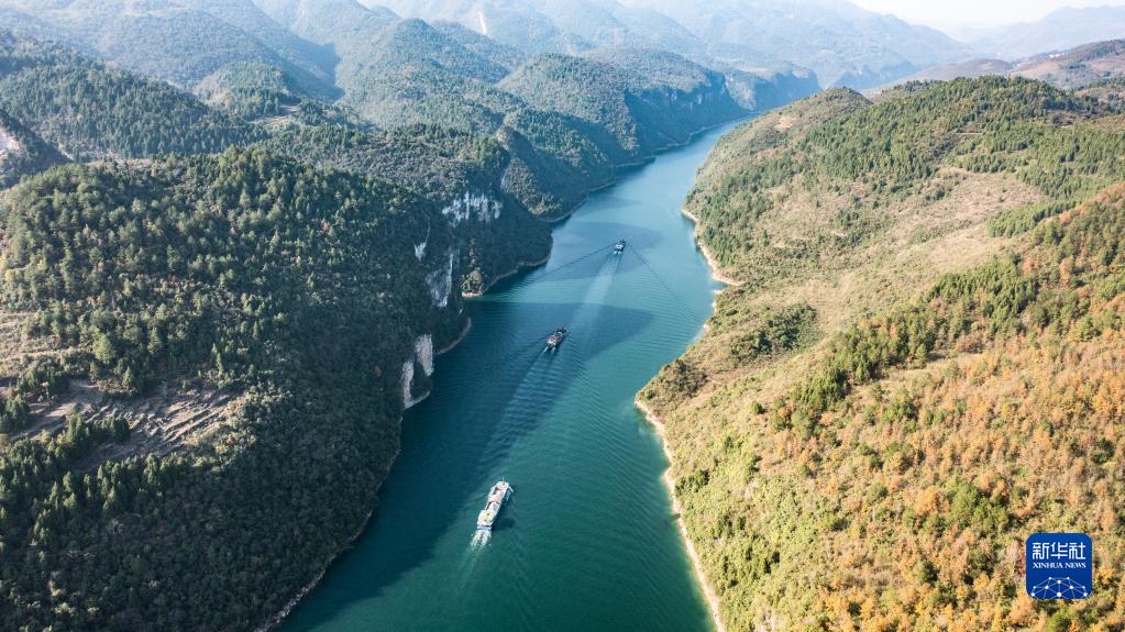 運(yùn)載磷礦石的貨船沿烏江航道順流航行(2021年11月18日攝,無人機(jī)照片)。 新華社記者 陶亮 攝