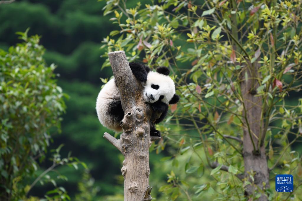 在中國(guó)大熊貓保護(hù)研究中心臥龍神樹坪基地內(nèi),一只大熊貓?jiān)跇渖闲菹ⅲ?022年4月24日攝)。 新華社記者 胥冰潔 攝