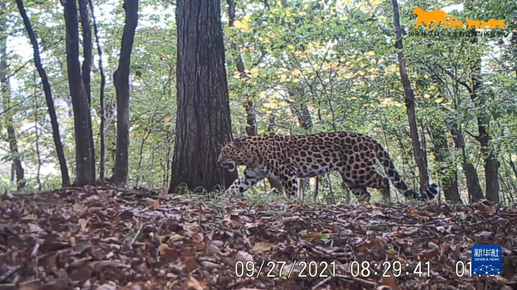 這是2021年9月27日利用“天地空一體化監(jiān)測(cè)系統(tǒng)”在東北虎豹國(guó)家公園內(nèi)監(jiān)測(cè)到的野生東北豹影像(視頻截圖)。 新華社發(fā)