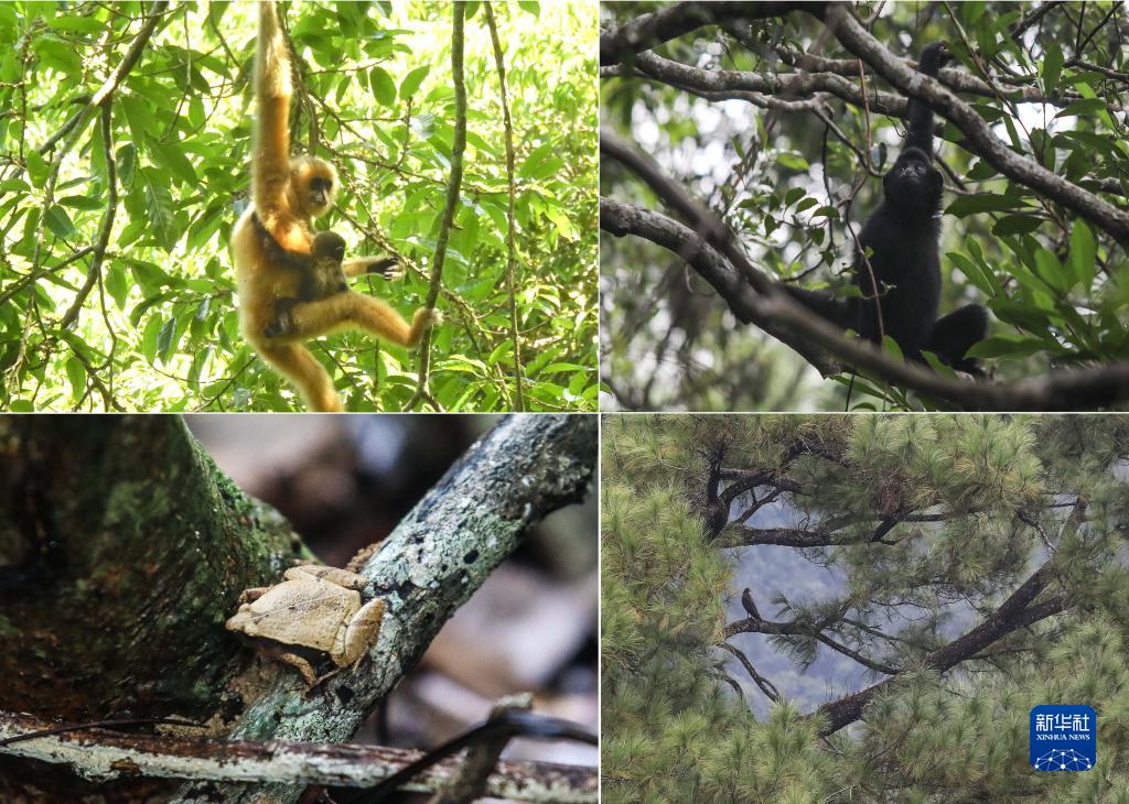 拼版照片:左上圖為2021年5月拍攝的海南長(zhǎng)臂猿B群幼猿(海南熱帶雨林國(guó)家公園管理局供圖);右上圖為在海南熱帶雨林國(guó)家公園體制試點(diǎn)區(qū)霸王嶺自然保護(hù)區(qū)內(nèi)拍攝的海南長(zhǎng)臂猿(2019年10月25日新華社記者蒲曉旭攝);左下圖為在霸王嶺自然保護(hù)區(qū)內(nèi)拍攝的姬蛙(2019年10月26日新華社記者蒲曉旭攝);右下圖為在霸王嶺自然保護(hù)區(qū)內(nèi)拍攝的蛇雕(2019年10月26日新華社記者蒲曉旭攝)。 新華社發(fā)